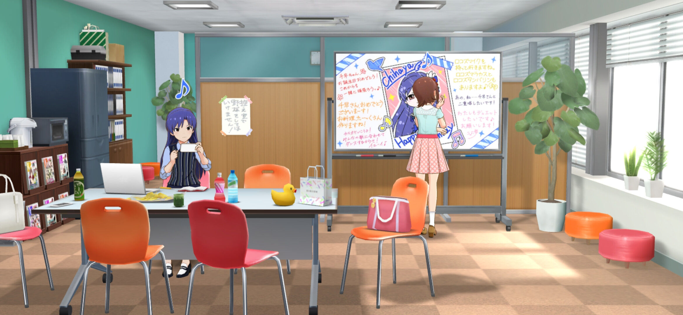 劇場のホワイトボードに春香ちゃんとやよいちゃんと歩ちゃんとロコちゃんとエミリーちゃんと星梨花ちゃんがメッセージを書いてくれたみたいですよ♪