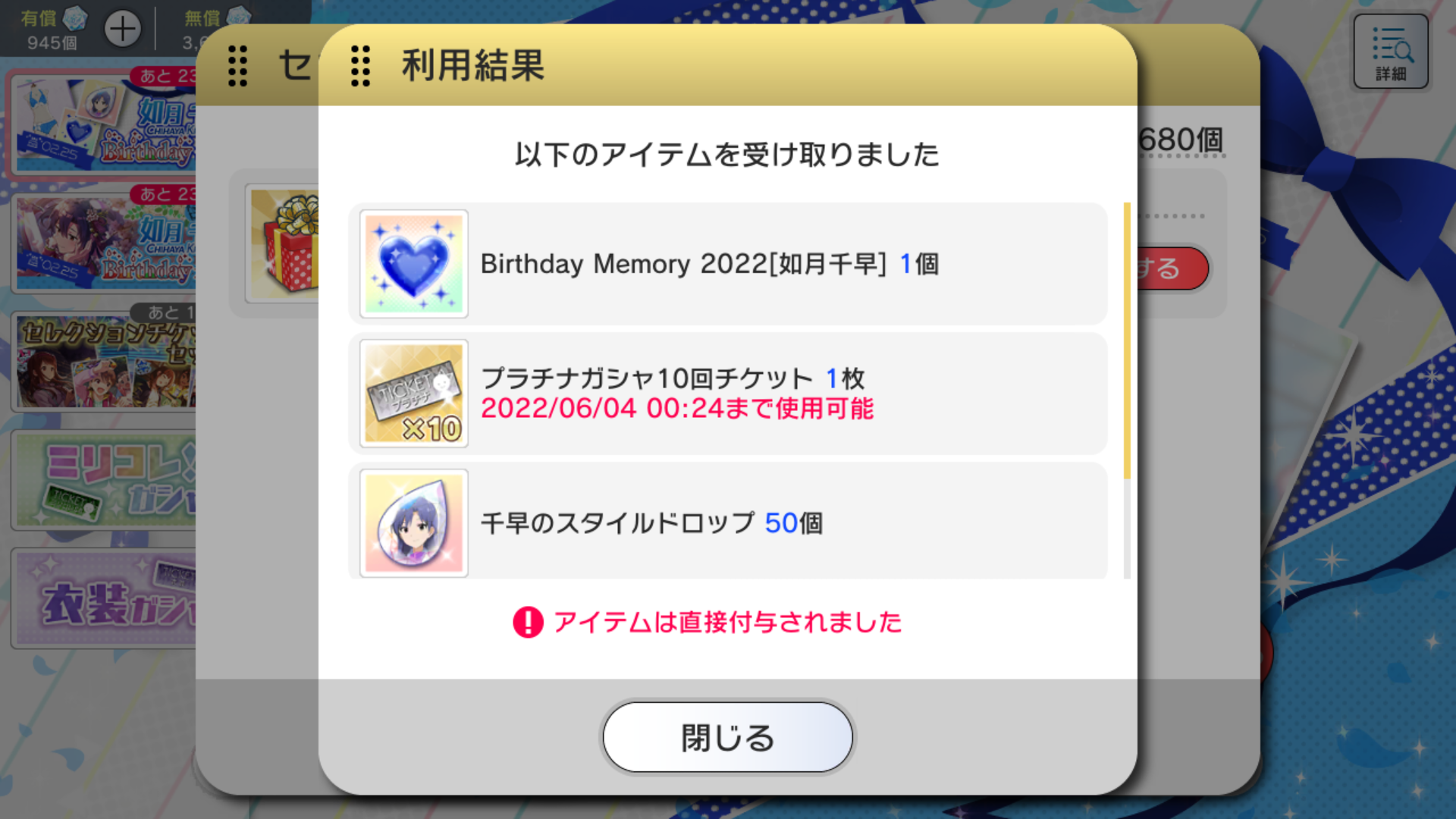 誕生日を記念して、「プラチナガシャ10回チケット」に衣装「マイオンリースイムウェア」「Birthday Memory 2022」「スタイルドロップ50個」が付いてきますよ♪