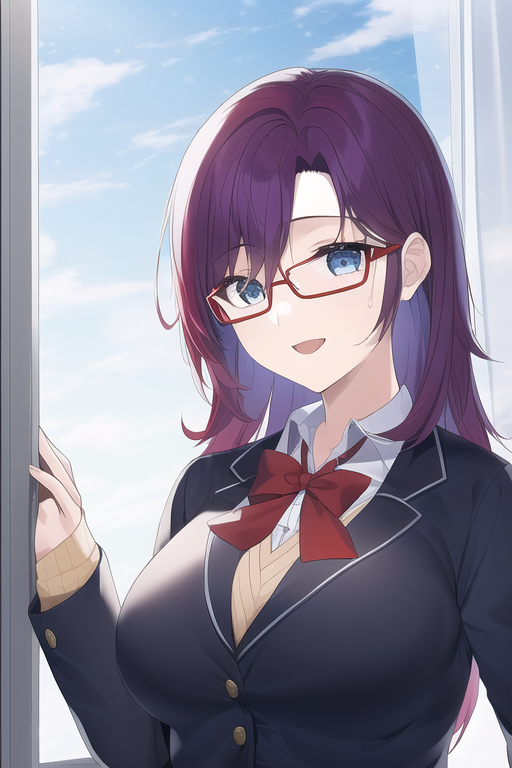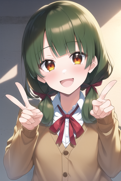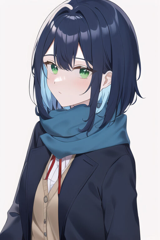 {{{{Adachi_sakura}}}},Indigo blue hair,green eyes,{wolf cut},winter high school uniform,light blue Scarf,medium hair,{{left parted hair}},red ribbon,light blue cardigan
