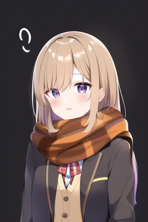 {{{{Shimamura_Hogetsu}}}},very light brown hair,purple eyes,{{{winter high school uniform}}},{orange and yellow check scarf},semi-long hair,{{right parted hair}},red ribbon,cardigan,drooping eye,young face,{{straight hair}},{{round eyes}}