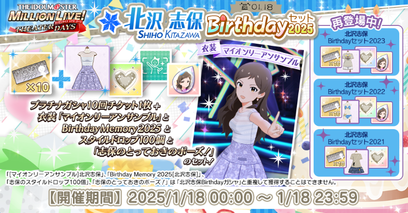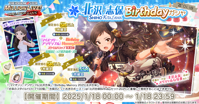 志保ちゃんのカードだけが登場する特別なガシャで1ステップ目に「マイオンリーアンサンブル」「Birthday Memory 2025」「スタイルドロップ100個」プライベートオーダー「とっておきのポーズ!」が特典で付いてきますよ♪#ミリシタ pic.twitter.com/SwFmd1xBhh