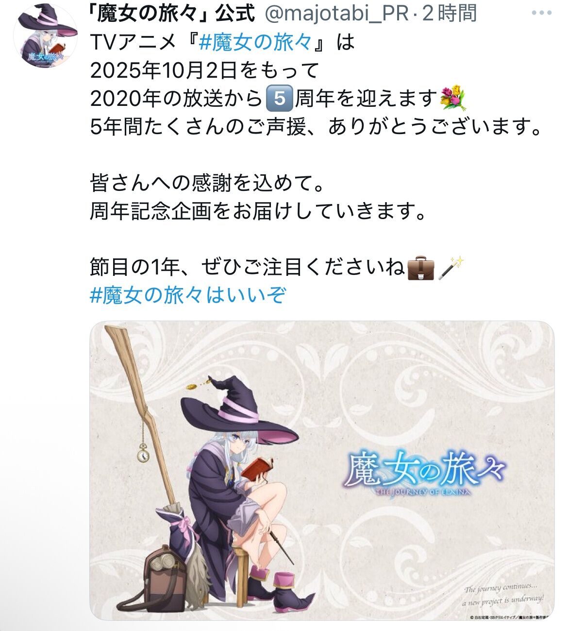 節目の1年、ぜひご注目くださいね💼🪄#魔女の旅々はいいぞ pic.twitter.com/eJSAceXT7P