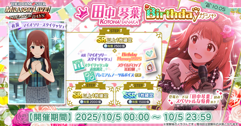 琴葉ちゃんのカードのみ登場するガシャで1ステップ目は衣装[マイオンリースタイリッシュ]田中琴葉、Birthday Memory 2025[田中琴葉]、琴葉のスタイルドロップ 100個、琴葉のスタイリッシュなお出迎え、プレミアムノーツ&ボイス[琴葉]付き♪#ミリシタ pic.twitter.com/RYNxTVYv4X